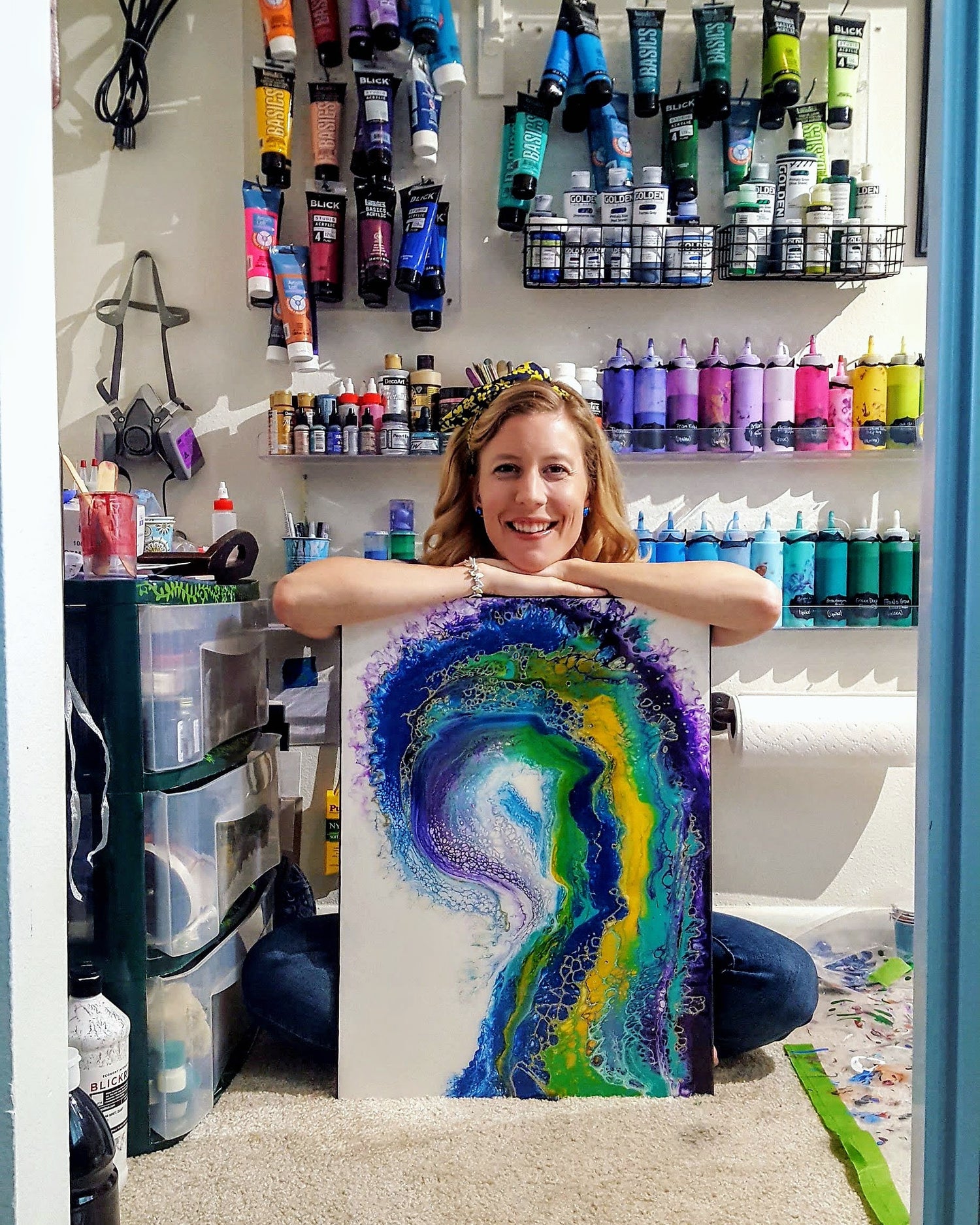 With a degree in Marine Science, and a love for experimentation, it is not only the finished piece that appeals to Sarah, but the entire process. She uses her passion for nature to incorporate organic shapes, and harnesses natural movement in her work. The ocean, and nature in its entirety, is a constant inspiration for the flow of her art. She has always had a fondness for bright and bold colors. Adding a “color pop” with a one-of-a-kind piece of art is a great way to bring joy into a room. When Sarah isn’t painting, she enjoys petting dogs, shopping at markets, competing in friendly board games, hiking, scuba diving, and spending time with family.