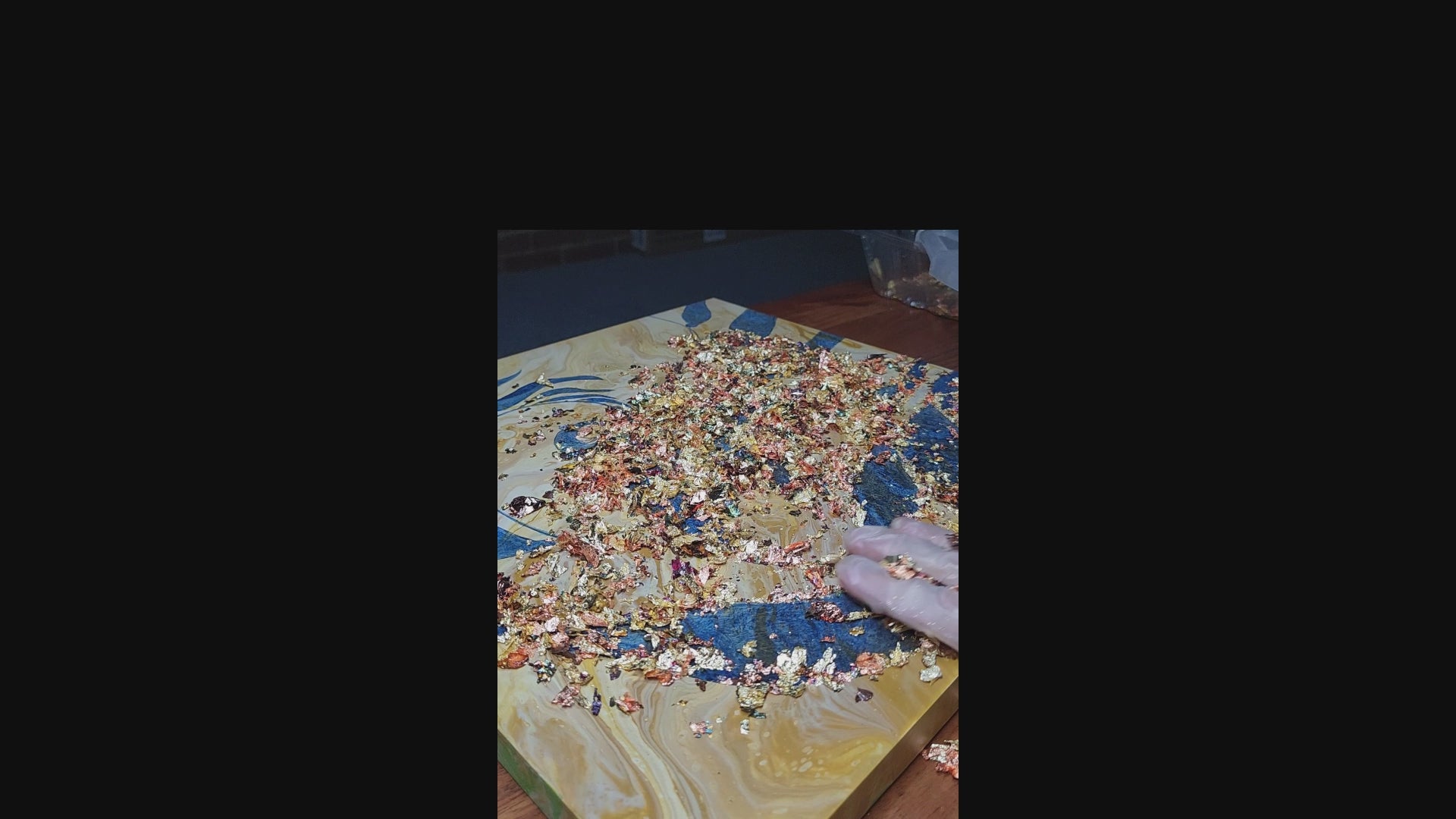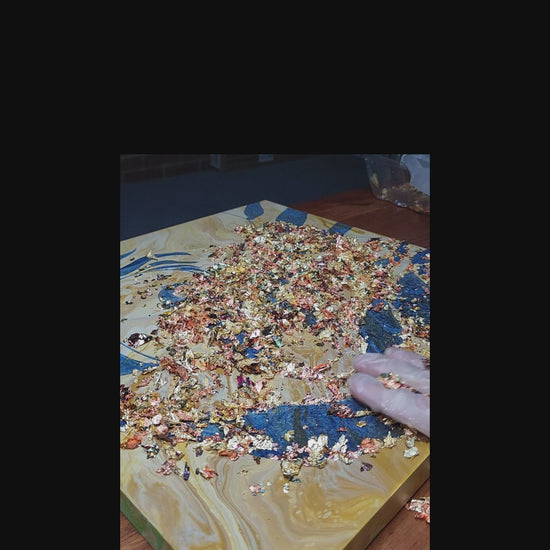 This is painted with acrylic paint and gilded with gold leaf. The technique of gilding was used; a delicate and tedious process with many steps that gives the most vibrant metallic results.