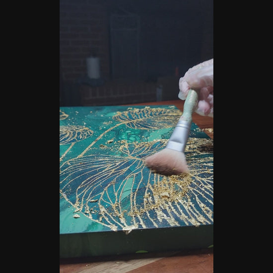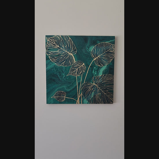 The background is a vibrant emerald green. The monstera leaves are done with gold leaf that catch the light beautifully.