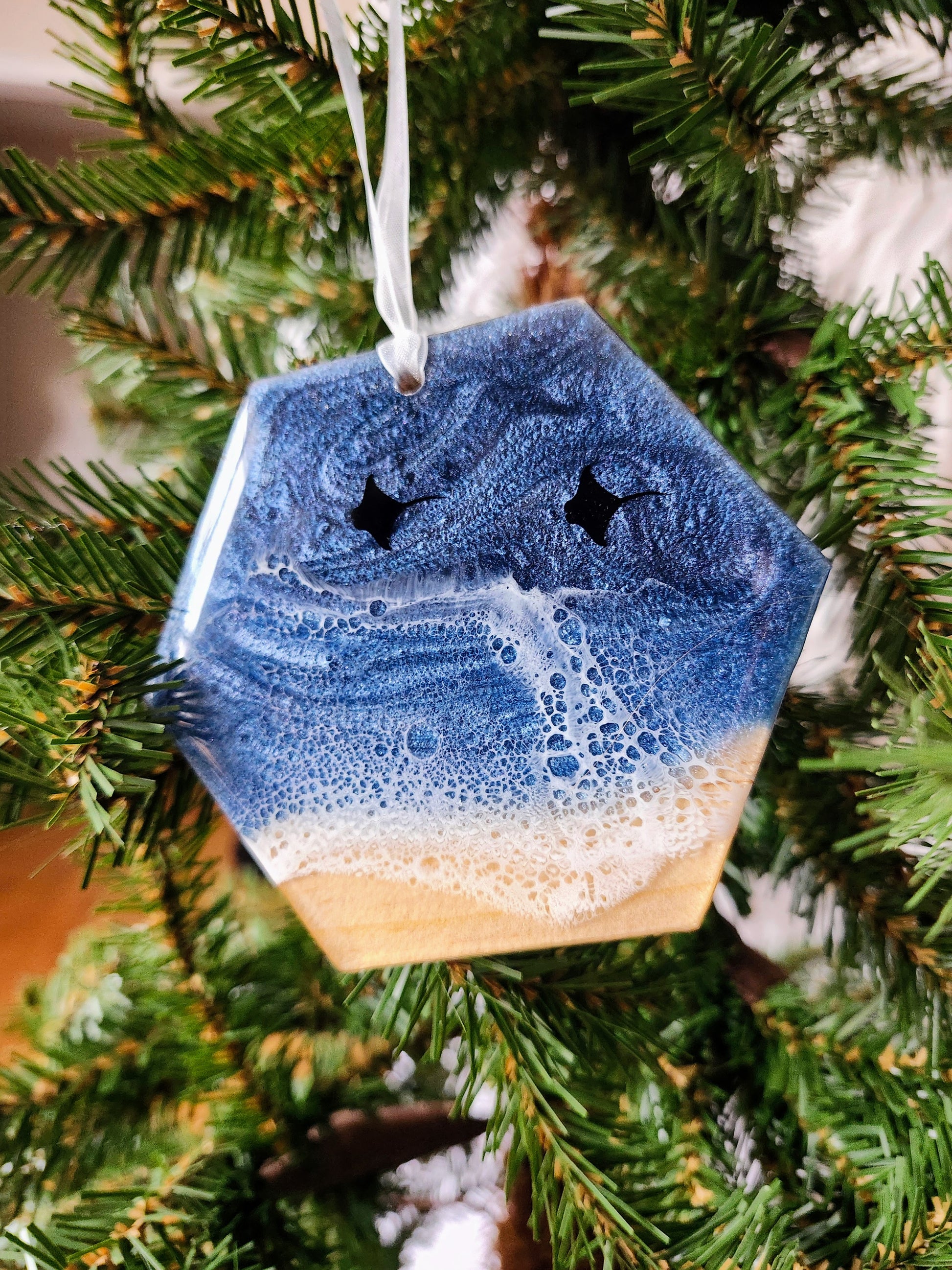 Handmade from high-quality epoxy resin, acrylic paint, and pine wood; these ornaments showcase delicate sea life silhouettes.