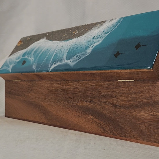 Hand painted walnut tea box featuring a sea turtle, two stingrays, and a textured sandy beach with seashells.