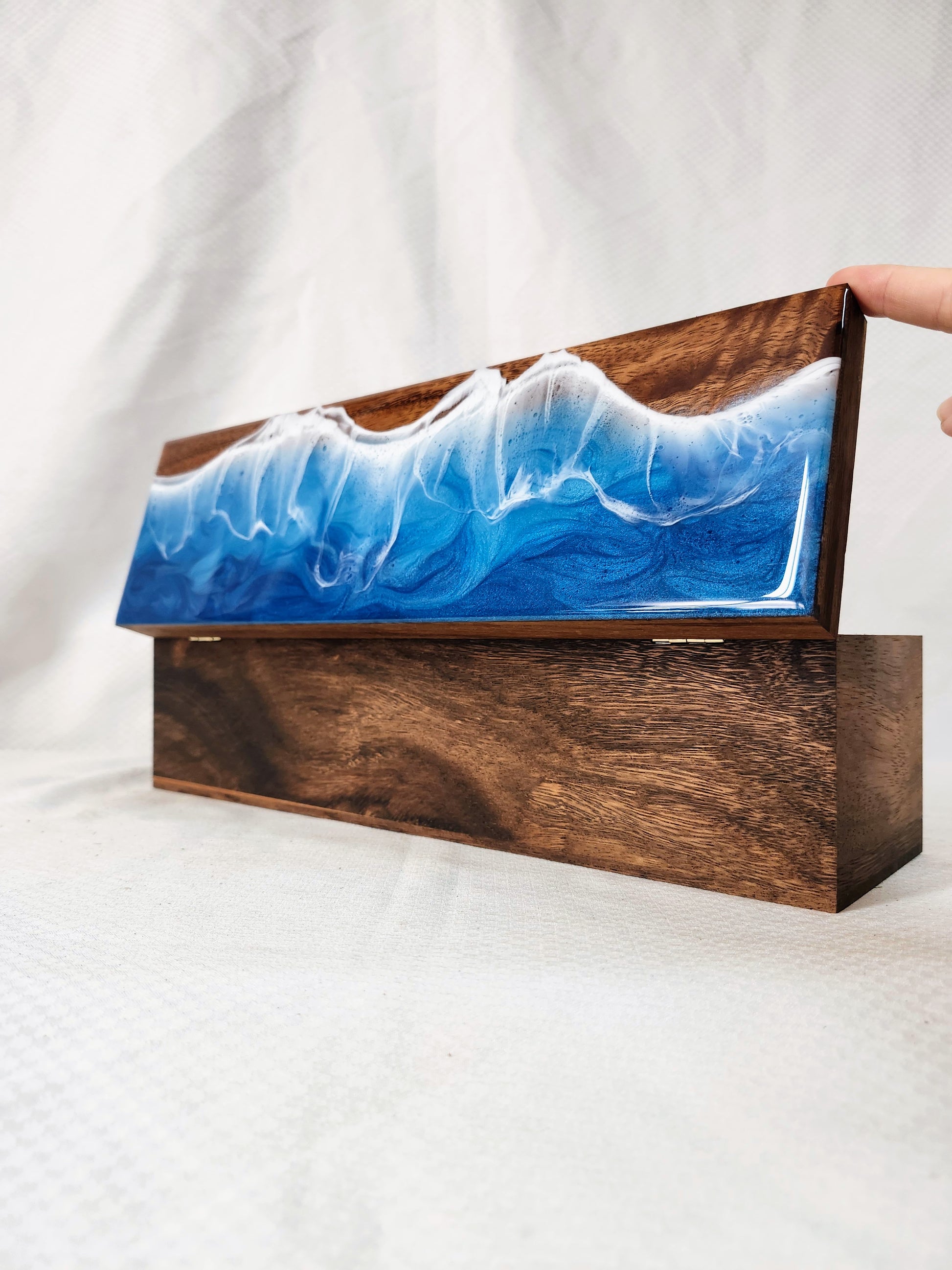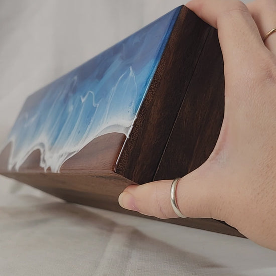 Hand painted walnut tea box featuring a gorgeous blue ocean and crashing waves against a wooden beach.