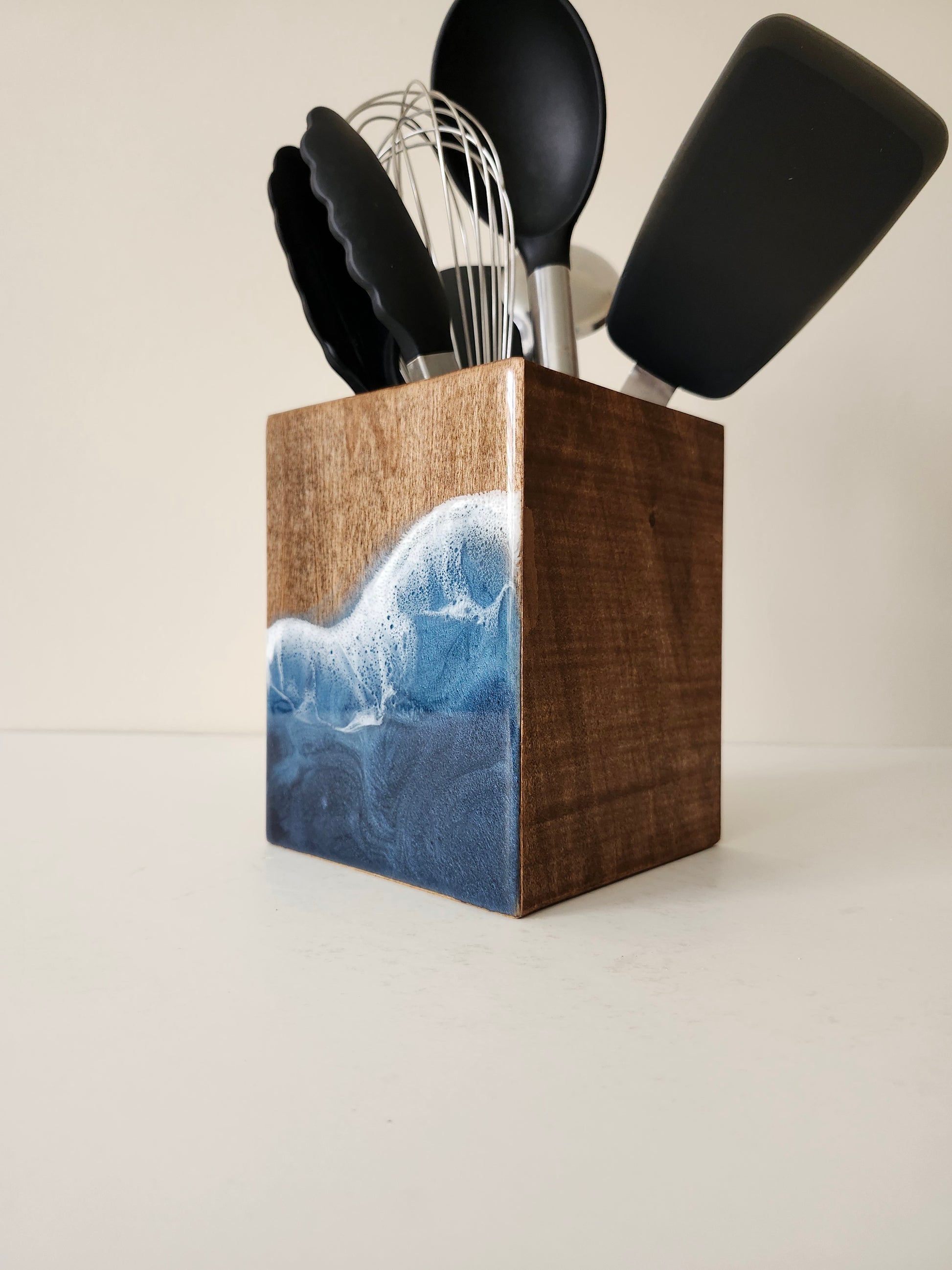Keep your utensils tidy with this one of a kind utensil holder. Handcrafted from poplar wood and hand painted with resin art, this piece is truly unique.